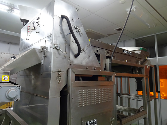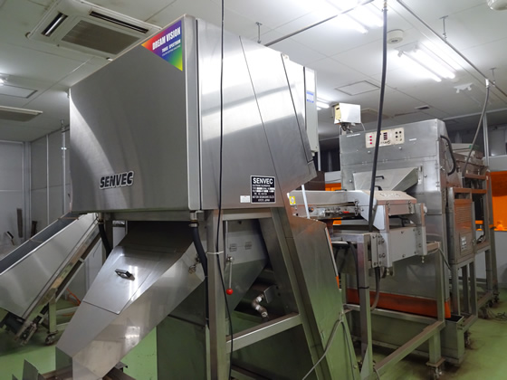 一台目で、ひじきの色(黒色)以外の異物を除去します。 二台目では、一台目で除去しきれなかった異物をもう一度検査し除去します。 二台とも、コンベアタイプのものを使用しています。