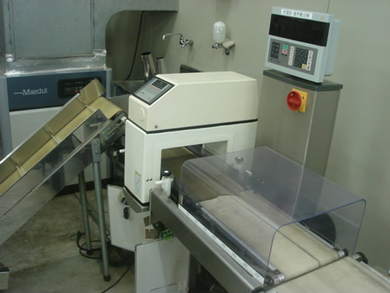 包装された製品は金属検出機を通り、オートチェッカーで再度計量を行ない良品、不良品を区分する。