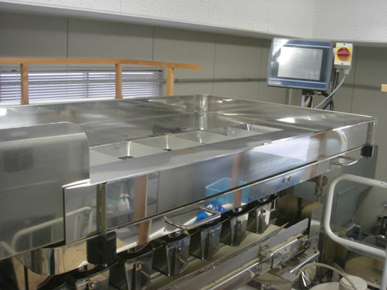 こちらの機械で、各商品にたいして的確な計量を行い、一袋分ずつコンベアで次の機械まで運んでいきます。